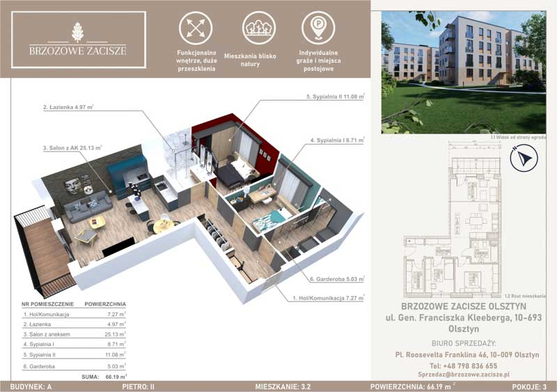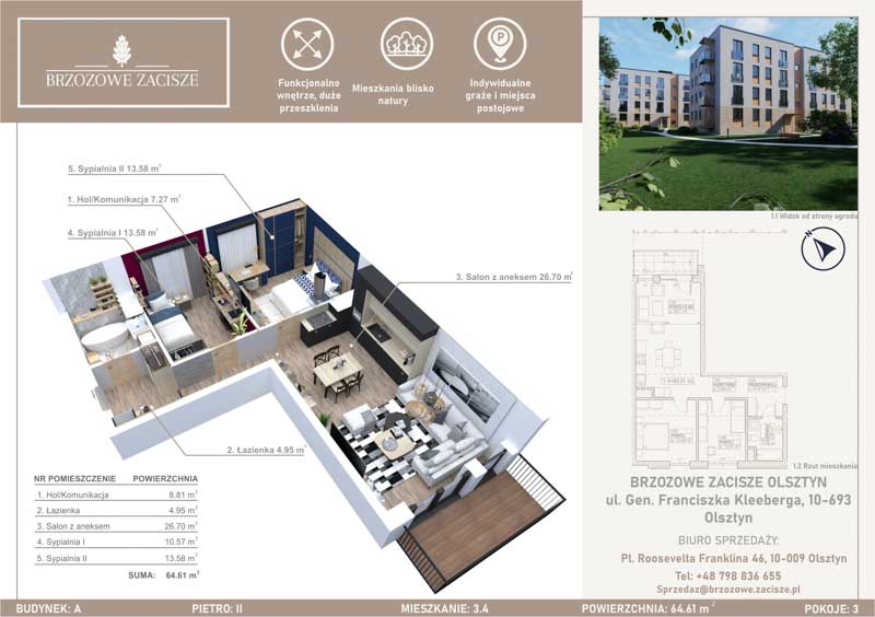 Przestronne 3-pokojowe mieszkanie o powierzchni 64,61 m² to doskonała propozycja dla rodzin, które szukają komfortu, funkcjonalności i nowoczesnego stylu. Znajduje się na II piętrze budynku A w prestiżowej inwestycji Brzozowe Zacisze w Olsztynie – miejscu, które łączy kameralny klimat z bliskością natury i miejskiej infrastruktury. W skład mieszkania wchodzą: jasny i przestronny salon z aneksem kuchennym (aż 26,70 m²), dwie ustawne sypialnie (każda po 13,58 m²), komfortowa łazienka oraz funkcjonalny hol z miejscem na zabudowę. Duże okna i przemyślany rozkład zapewniają świetne doświetlenie pomieszczeń oraz poczucie przestrzeni. Z salonu prowadzi wyjście na balkon – idealne miejsce na poranną kawę lub wieczorny odpoczynek. Mieszkanie zostało zaprojektowane z myślą o wygodzie domowników, a wysoki standard wykończenia inwestycji obejmuje m.in. indywidualne miejsca postojowe, spójną estetykę architektoniczną oraz nowoczesne rozwiązania technologiczne. Z Vision Complex zyskujesz nie tylko dopracowaną przestrzeń do życia, ale także pewność inwestycji w nieruchomość, która będzie cieszyć przez lata.