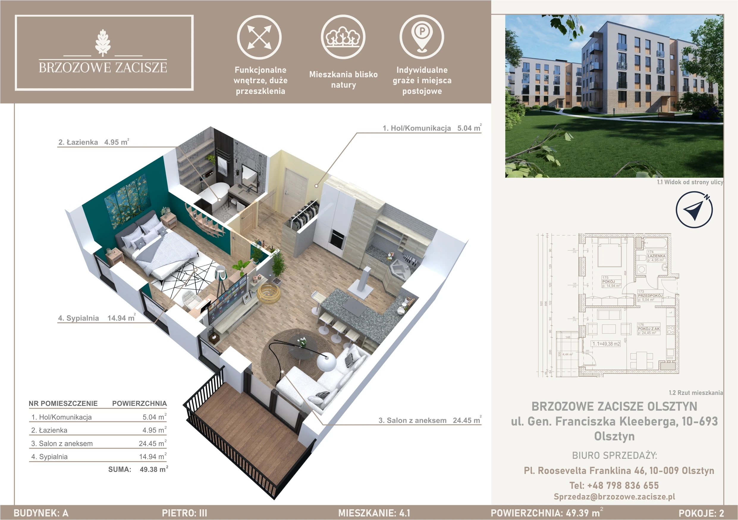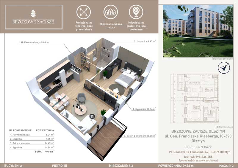 To 2-pokojowe mieszkanie o powierzchni 49,98 m² łączy w sobie nowoczesną funkcjonalność z elegancją i przytulnym klimatem. Znajdujące się na III piętrze budynku A, oferuje przestronny salon z aneksem kuchennym (25,05 m²) z wyjściem na balkon, który stanowi idealne miejsce do wypoczynku i codziennego relaksu. Do dyspozycji mieszkańców jest również komfortowa sypialnia (14,94 m²), elegancka łazienka (4,95 m²) oraz ergonomiczny hol. Przemyślany układ pomieszczeń zapewnia maksymalne wykorzystanie przestrzeni, a duże przeszklenia sprawiają, że wnętrze jest jasne i przyjazne. Mieszkanie jest idealne zarówno dla par, singli, jak i inwestorów poszukujących atrakcyjnej oferty pod wynajem. To gotowa do życia przestrzeń w spokojnym, zielonym otoczeniu – z pełnym zapleczem infrastrukturalnym i wysokim standardem wykonania. W Brzozowym Zaciszu liczy się każdy szczegół – od jakości materiałów po wygodę codziennego użytkowania.