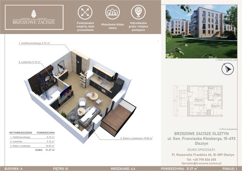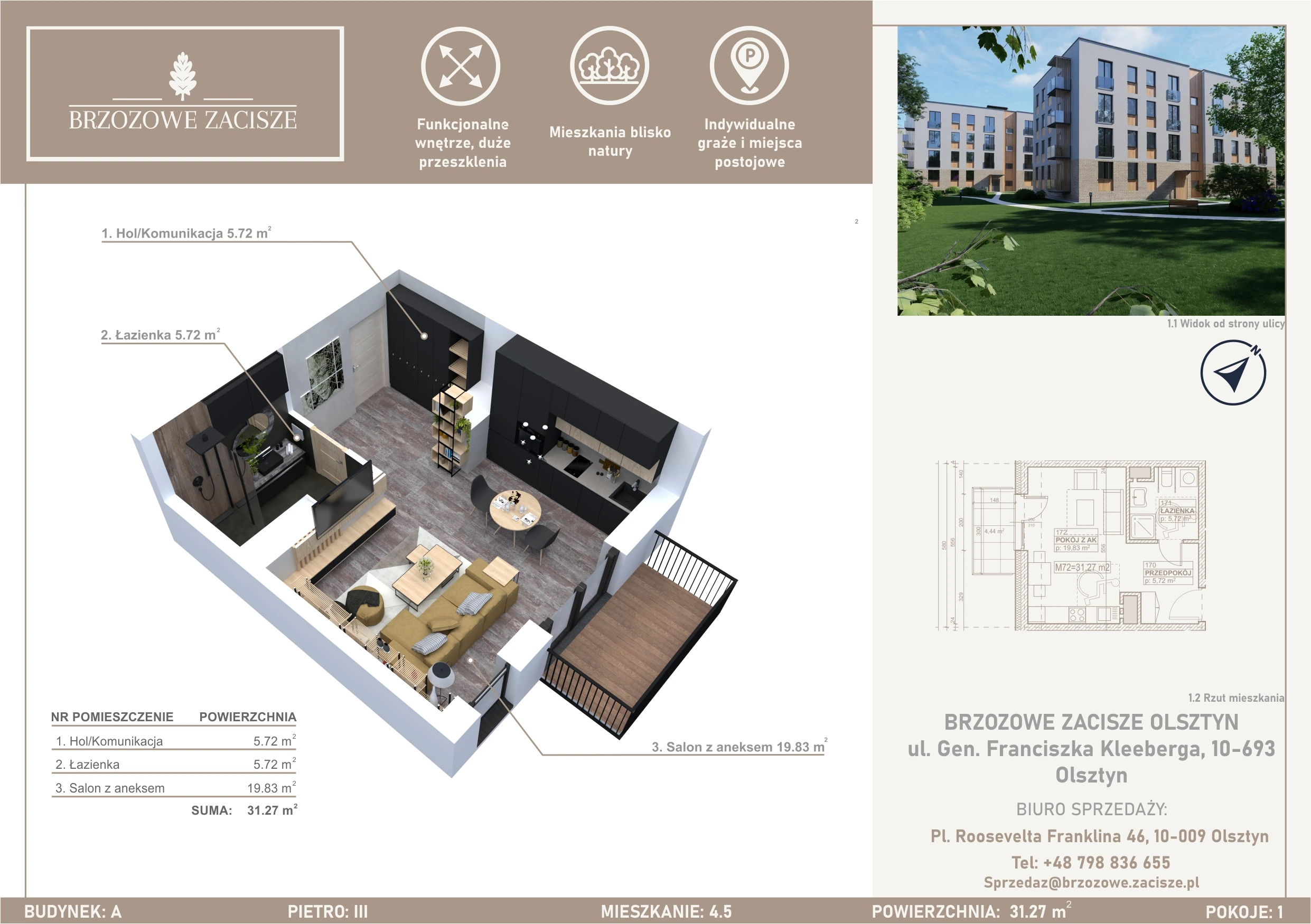 Mieszkanie 1-pokojowe z aneksem kuchennym o powierzchni 31,27 m² to doskonała propozycja dla singla, pary lub inwestora poszukującego nieruchomości pod wynajem. Znajduje się na III piętrze w nowoczesnym budynku A inwestycji Brzozowe Zacisze w Olsztynie – miejscu, które łączy spokojną, zieloną okolicę z wygodnym dostępem do miasta. Przemyślany układ pomieszczeń obejmuje przestronny salon z aneksem kuchennym (19,83 m²), ustawny hol (5,72 m²) oraz komfortową łazienkę (5,72 m²). Duże przeszklenia zapewniają doskonałe doświetlenie wnętrz, a wyjście na balkon sprawia, że przestrzeń dzienna zyskuje dodatkowy wymiar wypoczynkowy. Mieszkanie jest w pełni funkcjonalne, zaprojektowane z dbałością o każdy szczegół, z miejscem na zabudowę kuchenną, szafę wnękową oraz wygodne strefy użytkowe. Deweloper zadbał o wysoki standard inwestycji – mieszkańcy mogą liczyć na indywidualne miejsca postojowe, funkcjonalny rozkład i spokojne otoczenie blisko natury. Brzozowe Zacisze to idealne miejsce dla osób, które cenią estetykę, komfort i przemyślaną architekturę – tutaj każde mieszkanie staje się przyjazną, nowoczesną przestrzenią do życia.